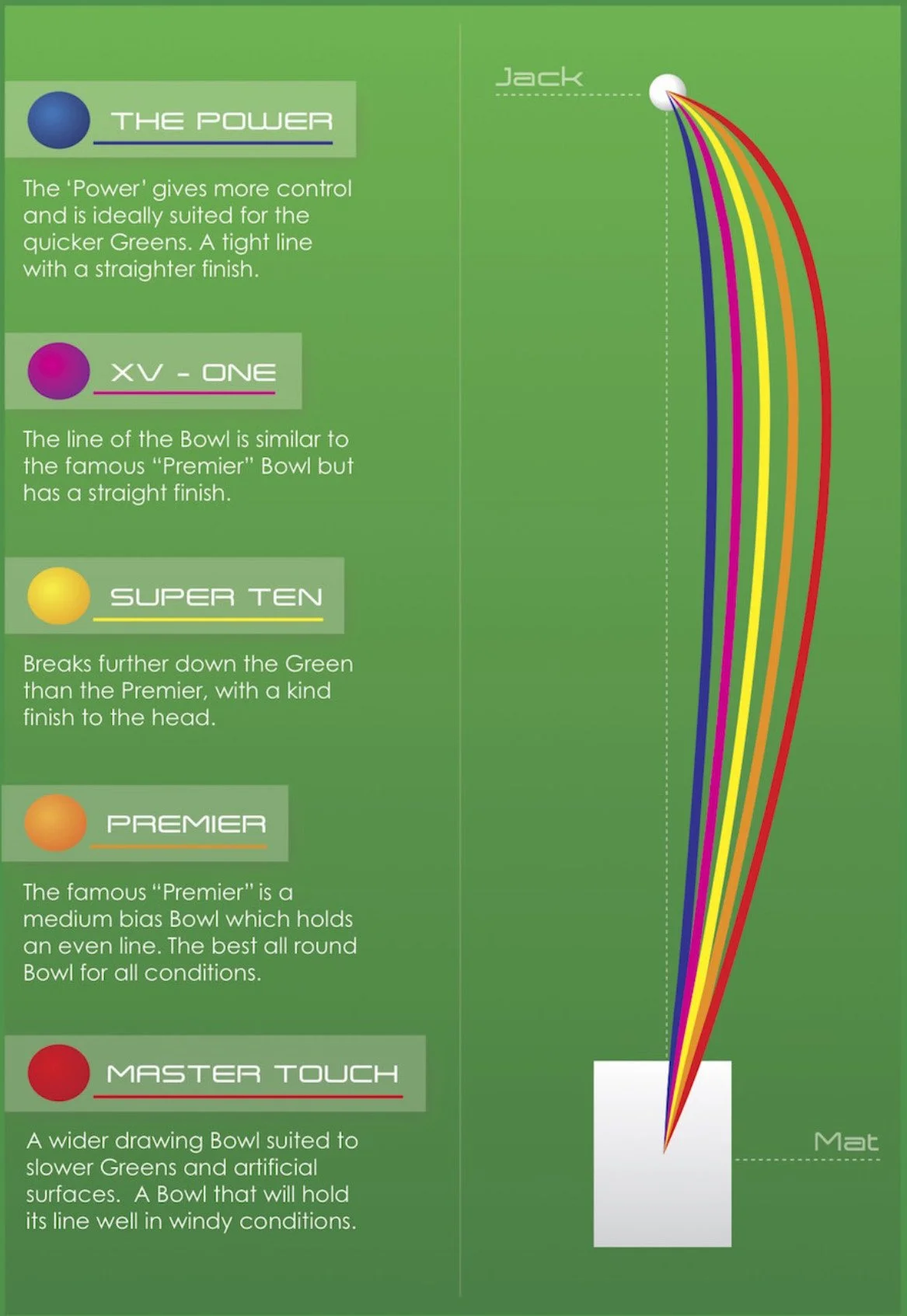 The famous Greenmaster Premier is a narrow bias lawn bowl and holds an even line. The ideal allrounder lawn bowl, the Premier is suitable for a range of conditions.